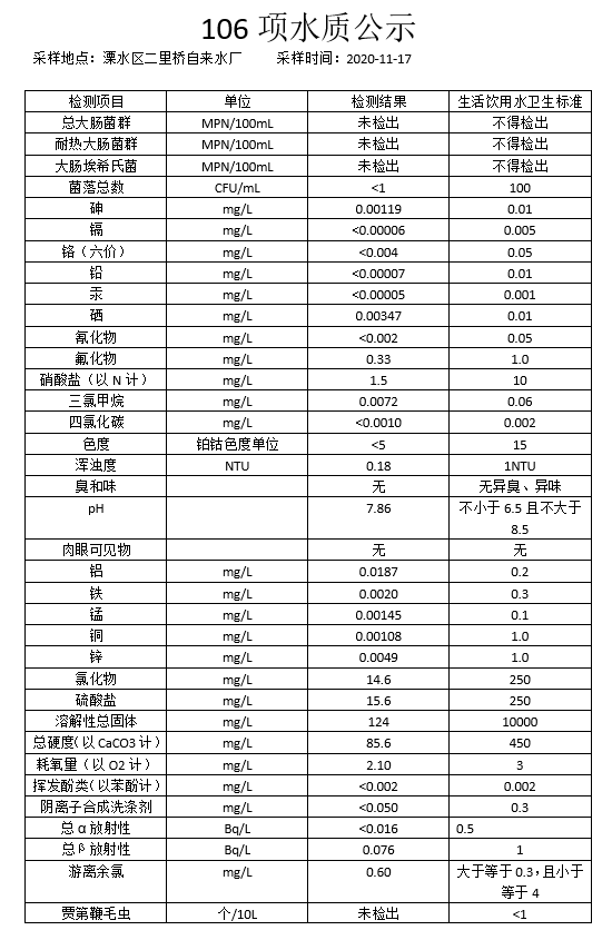 出廠水106項公示(半年度公示2020.12.28) 時間:2020-12-28 分類:水質(zhì)公示 上一篇: 出廠水每周公示(2020.12.22) 下一篇: 出廠水每周公示(2020.12.29) 相關(guān)文章 2025.9.23管網(wǎng)水(月全) 2025.9.23出廠水、管網(wǎng)末梢水常規(guī)42項指標(月度公示) 2025.9.4管網(wǎng)末梢、管網(wǎng)水(半月) 出廠水每周公示2025.10.13-2025.10.19 出廠水每周公示2025.10.6-2025.10.12 出廠水每周公示2025.9.29-2025.10.5 出廠水每周公示2025.9.22-2025.9.28 出廠水每周公示2025.9.15-2025.9.21