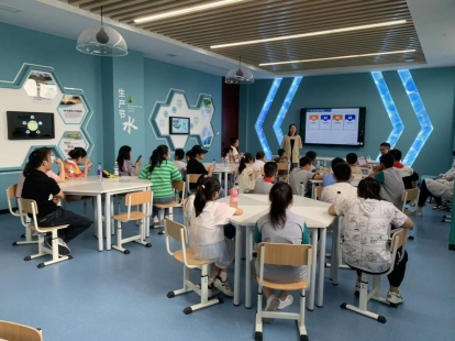 參觀完自來水廠生產流程之后,小朋友們又來到了集展示、宣傳、體驗、教育為一體的供排水教育基地。展廳內,新穎的設計、靚麗的水環境水生態組圖、有趣的科普動畫、科技感十足的互動屏,寓教于樂,圍繞“知水-愛水-惜水-護水-節水”和環境保護教育相關內容,向前來參觀的小朋友們傳播節水護水相關知識。