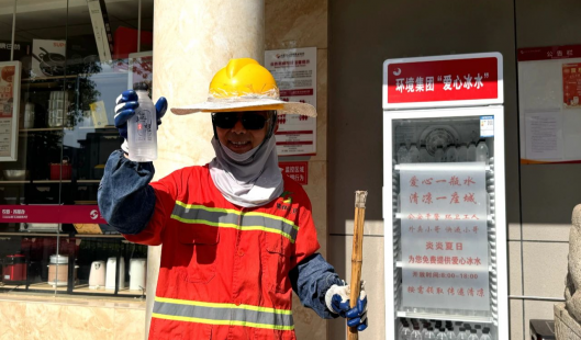 在位于永陽街道便民服務中心的農商行“愛心冰水”投放點,一位全身汗濕的環衛工人取出冰水,稍事休息,感受炎夏的“溫暖”涼意。他說:“天氣這么熱,有了這個愛心冰柜,戶外工作更加安心,我們真的很感謝!”
