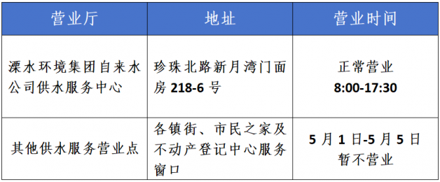 ?依據(jù)國務(wù)院辦公廳《關(guān)于2025年部分節(jié)假日安排的通知》,結(jié)合供水服務(wù)工作的實際情況,勞動節(jié)期間溧水環(huán)境集團(tuán)自來水公司各供水服務(wù)營業(yè)點放假安排如下: